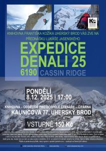 Knihovna Františka Kožíka vás zve na přednášku Lukáše Jasenského-EXPEDICE DENALI 2025 - 6190 CASSIN RIDGE. Dva roky, dvě expedice, jedna hora, Denali. S výškou 6190 metrů nejvyšší hora Severní Ameriky, avšak jedna z nejnáročnějších na světě skrz podmínky, které na ní panují. Pondělí 8. 12. 2025 v 17.00 hodin - knihovna čítárna - Panský dům, Kaunicova 77. Vstupné 150.00 Kč. Na této akci pořádané Knihovnou Františka Kožíka budou pořizovány obrazové a zvukové záznamy za účelem prezentace organizátora akce.