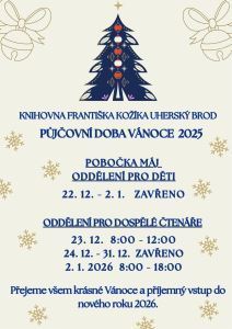 Půjčovní doba během vánočních svátků: Oddělení pro dětské čtenáře: Pátek 19. 12. 2025: 9.00 - 11.00 a 12.00-16.00 22.12.2025 -2. 1.2026-zavřeno Provoz bude zahájen 5.1.2026 v 9. 00. Oddělení pro dospělé čtenáře: Úterý 23. 12. 2025: 8.00 - 12.00 24.12.2025 -1. 1.2026-zavřeno Provoz bude zahájen 2.1.2026 v 8. 00, otevřeno bude až do 18. 00. Pobočka Máj: Pátek 19. 12. 2025: 9.00 - 11.00 a 12.00-16.00 22.12.2025 -2. 1.2026-zavřeno Provoz bude zahájen 5.1.2026 v 8. 00. Pobočka Újezdec: Ve středu 24.12.2025 - 6.1.2026 bude knihovna UZAVŘENA. Ve středu 7.1.2026 od 15.00 hodin bude v knihovně OTEVŘENO.