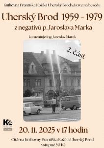 Knihovna Františka Kožíka Uherský Brod vás zve na besedu - Uherský Brod 1959 - 1979 z negativů pana Jaroslava Marka - 2. část. Fotografie komentuje ing. Jaroslav Marek. Kdy: čtvrtek 20. 11. 2025 v 17 hodin Kde: čítárna Knihovny Františka Kožíka Uherský Brod Vstupné: 50 Kč Na této akci pořádané Knihovnou Františka Kožíka budou pořizovány obrazové a zvukové záznamy za účelem prezentace organizátora akce.
