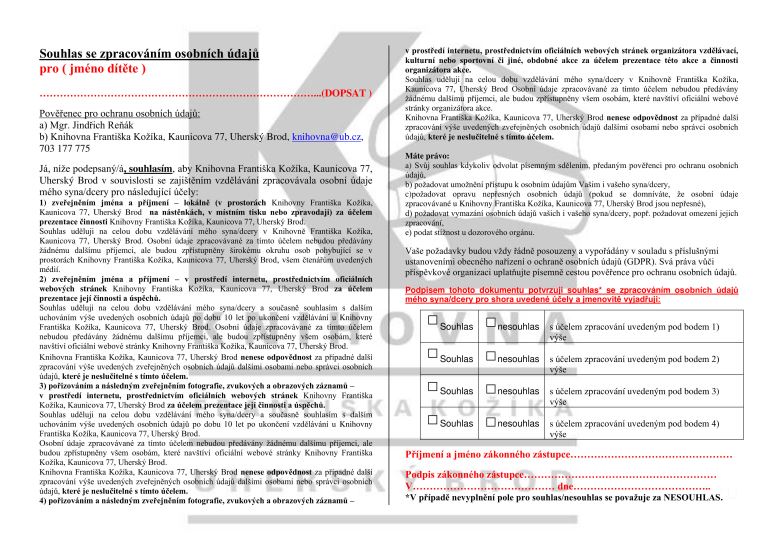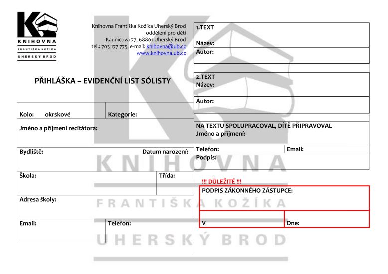 Knihovna Františka Kožíka Uherský Brod, oddělení pro děti pořádá 18. 2. 2026 v 8.00 hodin tradiční "OKRSKOVÉ KOLO RECITAČNÍ SOUTĚŽE" žáků základních škol a víceletého gymnázia z regionu Uherský Brod a okolí. Kdy: 18. 2. 2026 v 8.00 hodin, Knihovna Františka Kožíka Uherský Brod, Panský dům, Kaunicova 77. Na této akci pořádané Knihovnou Františka Kožíka budou pořizovány obrazové a zvukové záznamy za účelem prezentace organizátora akce.